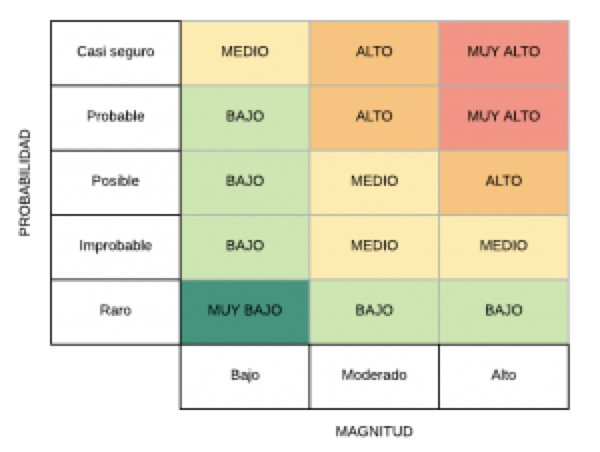 Vamos a crear una matriz para la caracterización de peligros. Teniendo en cuenta las directrices del CAC, los peligros se evaluarán en función de la probabilidad que ocurra y de la magnitud del peligro. Nos saldría una matriz de este tipo: